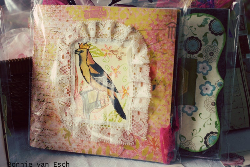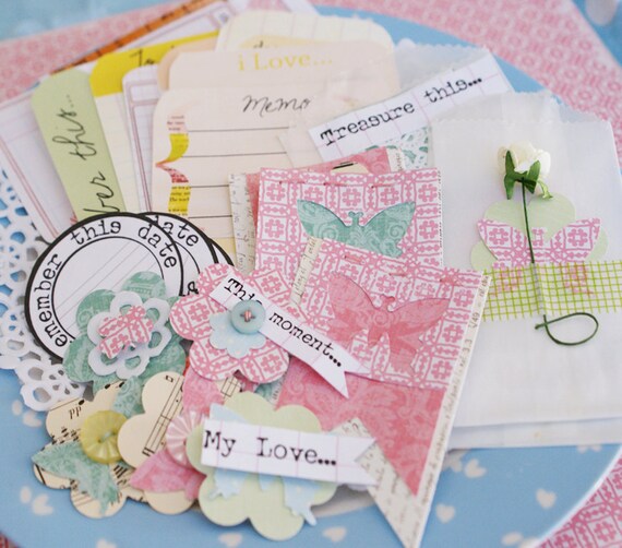 I used the papers I sell in my shop. (although these particular papers are not the ones in the kit, but they are ones I have designed and printed). I wanted to show what they look like with all the ribbon, lace and tags in the kits.